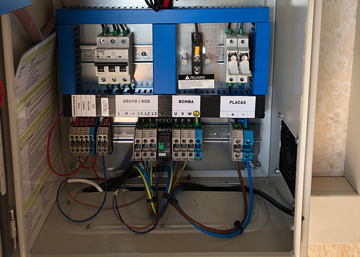 Se encarga transformar la corriente continua producida por las placas solares en corriente alterna apta para ser utilizada por la instalación de bombeo solar.